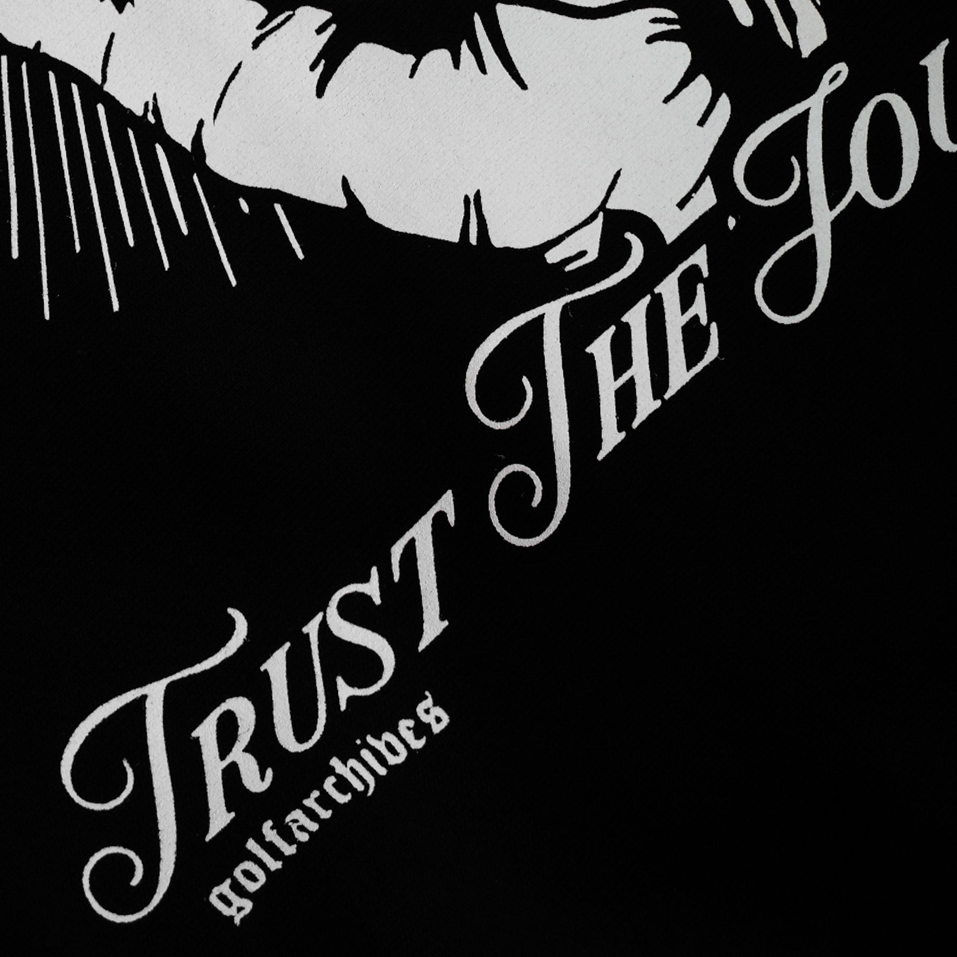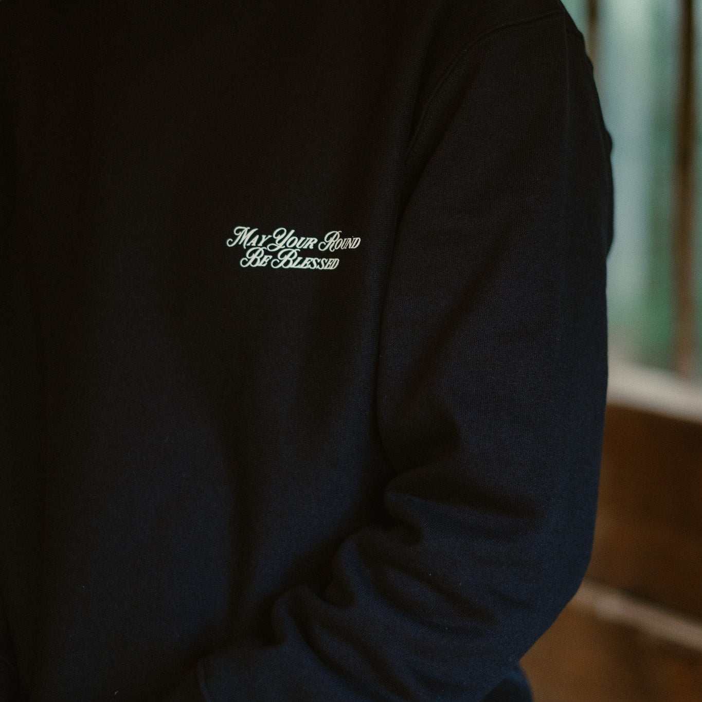 このスウェットに描かれているのは、アルブレヒト・デューラーの名作版画「祈る手(Praying Hands)」をモチーフにしたデザイン。左胸には「May Your Round Be Blessed(あなたのラウンドに祝福を)」、背中には光に包まれた祈りの手と「Trust The Journey(これまでの軌跡を信じて)」のメッセージ。